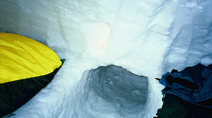 Once there, we proceeded to dig a snow cave. It took hours. Eventually it was done, and had enough room for both our sleeping bags and gear, but not enough head room to sit up.